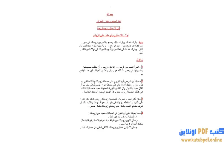 تحميل كتاب إلى كل متزوج ومتزوجة PDF – عبدالحميد رميته – في كتابه إلى كل متزوج ومتزوجة، يقدم عبدالحميد رميته مجموعة من النصائح والتوجيهات المهمة التي تهدف إلى تعزيز الحياة الزوجية وتحقيق الاستقرار الأسري. يبدأ الكتاب بدعاء للزوجين، يتمنى لهما البركة في حياتهما الزوجية ورزق ذرية طيبة تكون عتقا لهما من النار. يركز رميته على أهمية العيش في بيئة يسودها الأمن والأمان، حيث تظللها المودة والرحمة، مما يسهم في بناء أسرة مستقرة.