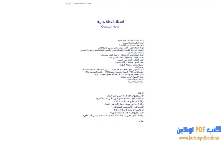 تحميل كتاب اعتقال لحظة هاربة PDF – غادة السمان – تقدم غادة السمان في كتابها "اعتقال لحظة هاربة" رؤية عميقة ومؤثرة عن مشاعر الإنسان التي تتجلى في لحظات الحزن والفرح. تتحدث الكاتبة عن تجربة قلب مرهق ومتألم، حيث تتجسد مشاعر الجرح والحزن كما لو كانت مطراً أسود في محطة قطار نائية، مما يضفي أجواء من الكآبة والعزلة. تعكس السمان في كلماتها عالماً مليئاً بالضجيج والثرثرة، حيث يبدو أن الناس يلجؤون إلى الكلام كوسيلة للهروب من مواجهة أعماقهم، مما يخلق شعوراً بالفراغ في المعنى رغم كثرة الكلمات.