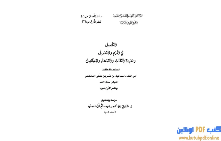 تحميل كتاب التكميل في الجرح والتعديل ومعرفة الثقات والضعفاء والمجاهيل 4 PDF – ابن كثير – كتاب التكميل في الجرح والتعديل ومعرفة الثقات والضعفاء والمجاهيل من تأليف ابن كثير هو أحد المراجع القيمة التي يعتمد عليها الباحثون في علوم الحديث الشريف ويعتبر مرجعاً أساسياً في فهم الجرح والتعديل وهو علم يختص بتقييم رواة الأحاديث من حيث الثقة والضعف والمجاهيل. يتميز الكتاب بجمعه بين الدقة والعمق في تحليل الشخصيات التي نقلت الأحاديث النبوية مما يجعله مصدراً مهماً لمن يسعى لفهم الروايات والأسانيد بشكل أفضل.