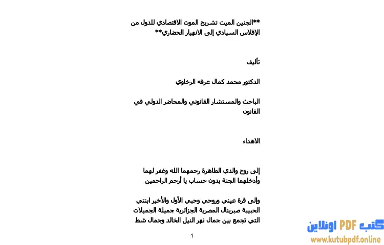 تحميل كتاب الجنين الميت PDF – محمد كمال الرخاوي – يتناول كتاب "الجنين الميت: تشريح الموت الاقتصادي للدول من الإفلاس السيادي إلى الانهيار الحضاري" للمؤلف دكتور محمد كمال الرخاوي موضوعًا حيويًا يتعلق بالأزمات الاقتصادية التي تعاني منها الدول. يستعرض المؤلف من خلال صفحات الكتاب مجموعة من الظواهر الاقتصادية التي تؤدي إلى انهيار الأنظمة المالية والسياسية، موضحًا كيف يمكن أن يؤدي الإفلاس السيادي إلى تداعيات خطيرة على المجتمع والدولة ككل.