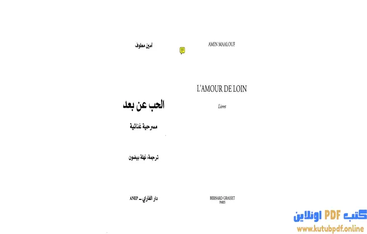 تحميل كتاب الحب عن بعد PDF – أمين معلوف – مغنّاة "الحب عن بعد" هي أوبرا من تأليف كايجا سارياهو ونص أمين معلوف، وقد أخرجها بيتر سيلار لمهرجان سالزبورغ في أغسطس من العام 2000 تحت إدارة كنت ناغانو. تؤدي داون أوبشاو دور كليمانس بينما يظهر دواوين كروفت في دور جوفري روديل ودغمار بيكوفا في دور الحاج. تدور أحداث الأوبرا في القرن الثاني عشر، حيث تتنقل بين مقاطعة أكيتين الفرنسية ومدينة طرابلس وعرض البحر، وهي تتألف من خمسة فصول تروي قصة جوفري روديل، أمير بلاد بلاي، الذي يشعر بالملل من حياة الترف التي يعيشها أقرانه ويتوق إلى حب بعيد يعتقد أنه لن يجده أبداً.
