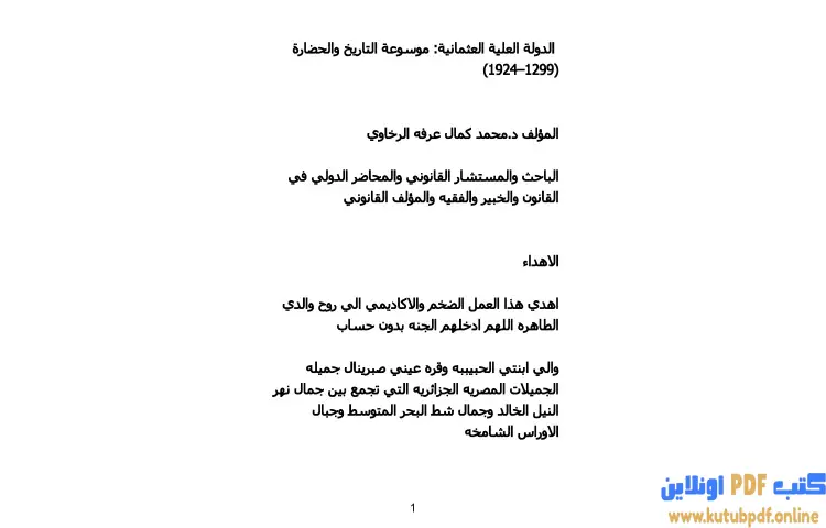 تحميل كتاب الدولة العلية العثمانية PDF – محمد كمال الرخاوي – يتناول كتاب "الدولة العلية العثمانية: موسوعة التاريخ والحضارة (1299–1924)" للدكتور محمد كمال الرخاوي فترة هامة من تاريخ الدولة العثمانية، التي كانت واحدة من أقوى الإمبراطوريات في العالم. يقدم الكتاب عرضًا شاملاً لمحطات رئيسية في تاريخ هذه الدولة، بدءًا من تأسيسها حتى انهيارها، مع التركيز على الجوانب السياسية والاجتماعية والثقافية التي شكلت هوية هذه الحضارة العظيمة. يسعى المؤلف إلى تقديم معلومات موثوقة مدعومة بالأدلة التاريخية والنصوص.