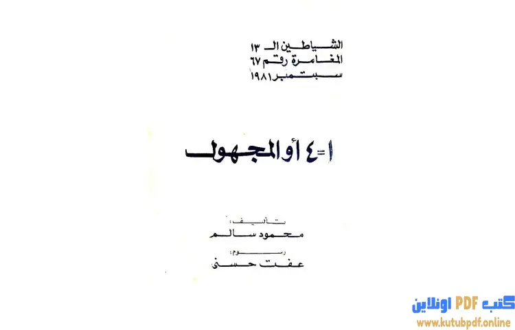 تحميل كتاب المجهول أو 1=4 PDF – محمود سالم – المجهول أو 1=4 هو عنوان رواية ضمن سلسلة الشياطين 13 للكاتب محمود سالم، وهي سلسلة روايات بوليسية صدرت في البداية في لبنان ثم انتقلت إلى مصر. تتميز هذه السلسلة بأحداثها المثيرة التي تجمع بين الحركة والتشويق، حيث تتناول مغامرات مجموعة من 13 فتى وفتاة يمثلون بلدانًا عربية مختلفة. يعمل هؤلاء الأبطال على مواجهة المؤامرات التي تستهدف الوطن العربي، مما يجعلهم في صراع دائم لحماية هويتهم وثقافاتهم.