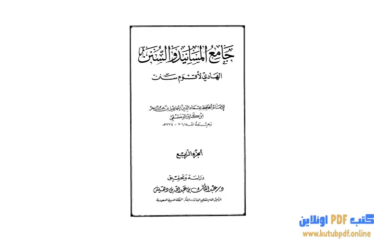 تحميل كتاب جامع المسانيد والسنن الهادي لأقوم سنن 4 PDF – ابن كثير – جامع المسانيد والسنن الهادي لأقوم سنن هو عمل من تأليف الحافظ أبو الفداء إسماعيل بن عمر بن كثير القرشي البصري الدمشقي الذي عاش بين عامي 700 هـ و774 هـ ويُروى أنه فقد بصره خلال تأليفه لهذا الكتاب حيث كان يجلس ليلاً مع السراج يكتب حتى فقد بصره وأعرب عن أمله في أن يقيض الله له من يكمل هذا العمل الذي وصفه بالسهل ويُعتبر الكتاب شاملاً لكل ما كتبه ابن كثير باستثناء مسند الخلفاء الراشدين ومسند عمر بن الخطاب وبعض مسانيد المكثرين من الصحابة مثل مسند أنس ومسند جابر ومسند عائشة.