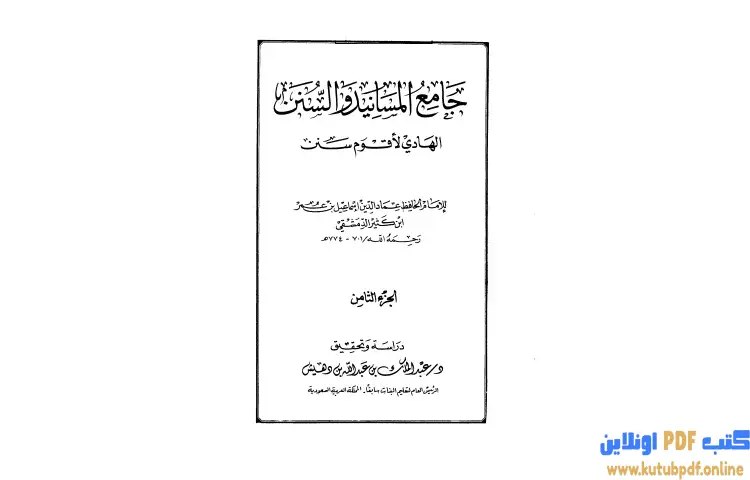 تحميل كتاب جامع المسانيد والسنن الهادي لأقوم سنن 8 PDF – ابن كثير – جامع المسانيد والسنن الهادي لأقوم سنن هو عمل علمي بارز ألفه الحافظ أبو الفداء إسماعيل بن عمر بن كثير القرشي البصري ثم الدمشقي الذي عاش بين عامي 700 هـ و774 هـ. يُروى أن ابن كثير فقد بصره أثناء تأليفه لهذا الكتاب، حيث كان يعمل عليه ليلاً تحت ضوء السراج حتى فقد بصره، معبراً عن أمله في أن يقيض الله له من يكمل هذا العمل الهام. يتضمن الكتاب مسند أبي هريرة رضي الله عنه، بالإضافة إلى أحاديث من الكتب الستة ومعجم الطبراني الكبير ومسند البزار ومسند أبي يعلى الموصلي.