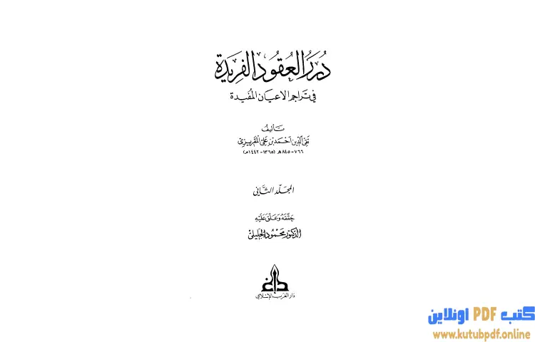 تحميل كتاب درر العقود الفريدة في تراجم الأعيان المفيدة 2 PDF – تقي الدين المقريزي – يعتبر كتاب درر العقود الفريدة في تراجم الأعيان المفيدة للعلامة تقي الدين المقريزي من أبرز كتب التراجم التي تركت بصمة واضحة في تاريخ الأدب العربي. استغرق المقريزي وقتاً طويلاً في تأليف هذا الكتاب الذي يركز على تراجم الأعيان، حيث يقدم معلومات قيمة عن الشخصيات البارزة في تلك الفترة. يتضمن الكتاب رواية وقائع شهدها المقريزي، مما يعكس الظروف السياسية والاقتصادية والاجتماعية والعلمية التي سادت بين عامي 730 و860 هجرية.