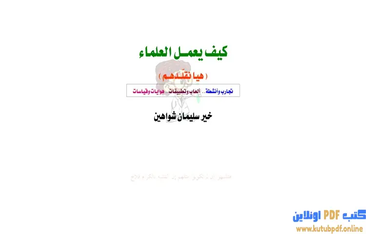 تحميل كتاب كيف يعمل العلماء PDF – خير سليمان شواهين – كتاب كيف يعمل العلماء للكاتب خير سليمان شواهين يوجه رسالته إلى الشباب الصغار الذين يحملون بذور الإبداع ويطمحون في استكشاف العالم من حولهم يتناول الكتاب منهج العلماء في العمل حيث يبدأ في شرح كيفية نشوء الأفكار العلمية انطلاقا من ملاحظة بسيطة تثير تساؤلات معينة ومن ثم ينتقل العالم إلى المختبر لإجراء التجارب العملية التي تساعده في الحصول على معلومات علمية دقيقة