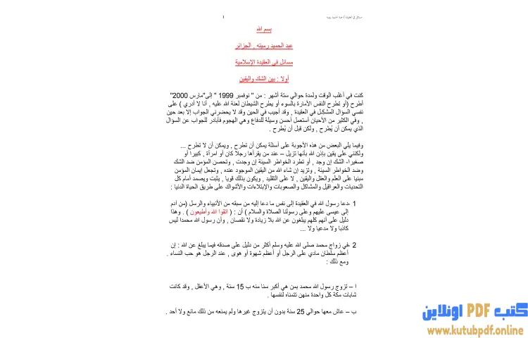 تحميل كتاب مسائل في العقيدة الإسلامية PDF – عبدالحميد رميته – تتناول كتاب مسائل في العقيدة الإسلامية للكاتب عبدالحميد رميته مجموعة من القضايا الأساسية التي تشكل جوهر الإيمان والعقيدة في الإسلام. يبدأ الكتاب بمناقشة مفهوم الشك واليقين، موضحا الفروق بينهما وكيفية الوصول إلى اليقين في الإيمان. يطرح الكاتب تساؤلات فلسفية حول طبيعة الإيمان وكيف يمكن للفرد أن يتجاوز الشكوك التي قد تعترض طريقه.