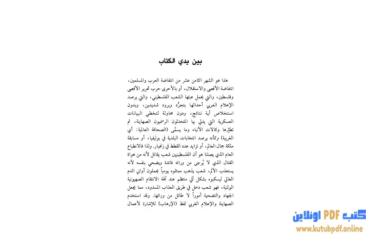 يتناول الكتاب أيضاً أهمية طرح مبادرات سياسية مدعومة بضغط عربي وإسلامي تتماشى مع الحقوق المشروعة التي لا يمكن التنازل عنها للشعب الفلسطيني، مؤكدًا على أن كفاح هذا الشعب يعد نجماً ساطعاً في وجه الكذابين والمزيفين والواقعيين الانهزاميين. يعكس الكتاب بوضوح قدرة الفلسطينيين على الصمود والمثابرة والإبداع في كفاحهم من أجل شرف الأمة وكرامتها ومصالحها وأمنها.