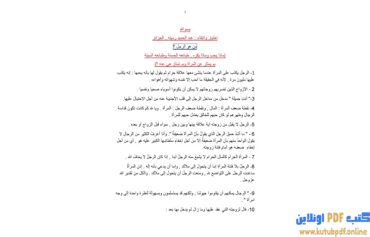 تحميل كتاب من هو الرجل PDF – عبدالحميد رميته – تتناول رواية "من هو الرجل" للكاتب عبدالحميد رميته موضوع العلاقة بين الرجل والمرأة بشكل عميق وشامل حيث يسلط الضوء على ما يميز كل منهما عن الآخر من خلال استعراض طبائع الرجل الحسنة والسيئة وما يحبه ويكرهه. يتناول الكاتب مسألة مهمة تتعلق بفهم المرأة لطبيعة الرجل وكيف أن هذا الفهم يمكن أن يؤثر بشكل كبير على حياتها وعلاقاتها معه سواء كان هذا الرجل أباً أو زوجاً أو ابناً أو أخاً.