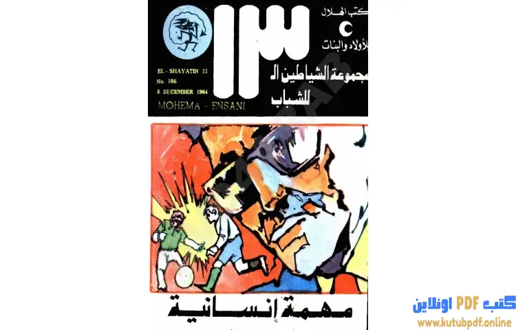 تحميل كتاب مهمة إنسانية PDF – محمود سالم – مهمة إنسانية هي رواية من تأليف الكاتب محمود سالم ضمن سلسلة الشياطين 13 التي تعتبر واحدة من السلاسل البوليسية المثيرة. بدأت هذه السلسلة بالصدور في لبنان قبل أن تنتقل لتنال شهرة واسعة في مصر. تدور أحداث الرواية حول مجموعة من ثلاثة عشر فتى وفتاة يمثلون بلداناً عربية مختلفة، حيث يتحدون لمواجهة المؤامرات التي تهدد الوطن العربي. يتدرب هؤلاء الأبطال في كهف سري مجهول للجميع، ويتقنون فنون القتال مثل استخدام المسدسات والخناجر والكاراتيه، إضافة إلى إجادتهم لعدة لغات.