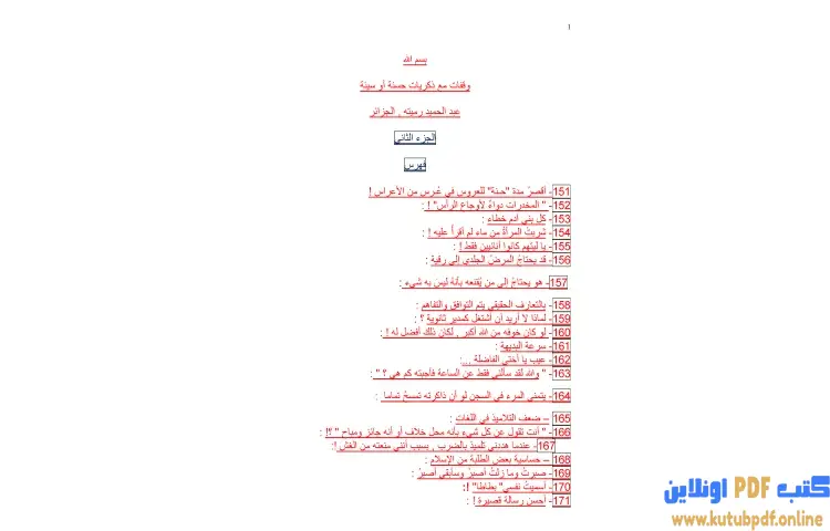 تحميل كتاب وقفات مع ذكريات حسنة أو سيئة 2 PDF – عبدالحميد رميته – يعد كتاب وقفــات مع ذكريات حسنة أو سيئة للكاتب عبدالحميد رميته من الأعمال الأدبية التي تسلط الضوء على تجارب شخصية مرت بها حياة الكاتب، حيث يسعى من خلال هذه المذكرات إلى تحقيق مجموعة من الأهداف النبيلة. يستهل الكاتب حديثه بإبراز أهمية تعليم الناس الدين، من خلال تناول بعض مسائل الحلال والحرام، خاصة في مجالات المعاملات، مما يساهم في توعية القراء بأحكام دينهم. كما يقوم بتسليط الضوء على الآداب والأخلاق الإسلامية، ليكون الكتاب مرجعاً في تعزيز القيم السليمة.