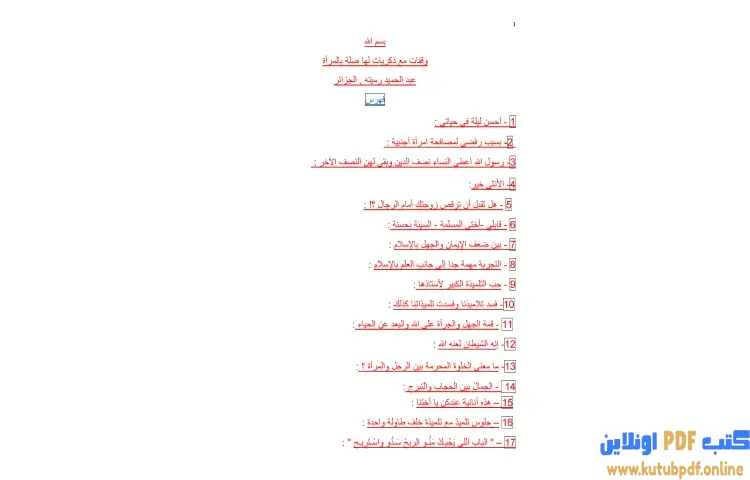 تحميل كتاب وقفات مع ذكريات لها صلة بالمرأة PDF – عبدالحميد رميته – في كتاب "وقفات مع ذكريات لها صلة بالمرأة" للكاتب عبدالحميد رميته، يستعرض المؤلف مجموعة من التجارب والمواقف التي تعكس رؤية عميقة للمرأة ودورها في المجتمع. يبدأ الكتاب بتجربة شخصية يتحدث فيها عن أحسن ليلة في حياته، حيث يكشف عن مشاعر مختلطة وأهمية اللحظات العاطفية في حياة الإنسان. ينتقل الكاتب بعد ذلك إلى موضوع الرفض الذي واجهه عند مصافحة امرأة أجنبية، ليعكس بذلك القيم والمبادئ التي يتمسك بها في تعامله مع الجنس الآخر.